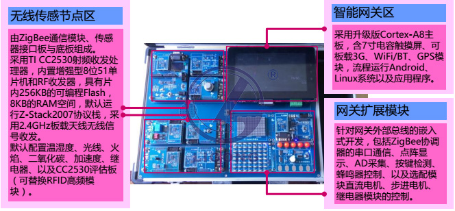 平臺(tái)主要包括 ZigBee 無(wú)線傳感器節(jié)點(diǎn)、升級(jí)版 Cortex-A8 智能網(wǎng)關(guān)、以及網(wǎng)關(guān)擴(kuò)展模塊等硬件資源。如圖所示:
