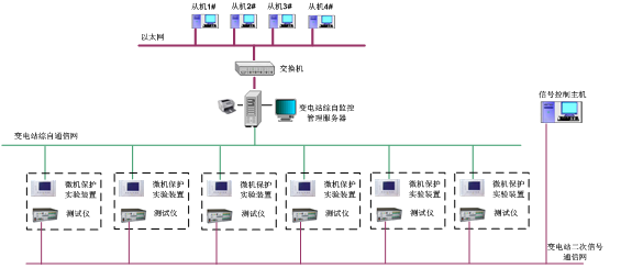 6套實(shí)驗(yàn)系統(tǒng)中的LGWX-III微機(jī)型繼電保護(hù)試驗(yàn)測(cè)試儀組成變電站二次信號(hào)通信網(wǎng)絡(luò),并采用信號(hào)控制主機(jī)實(shí)現(xiàn)變電站模型組態(tài)、潮流和故障控制。