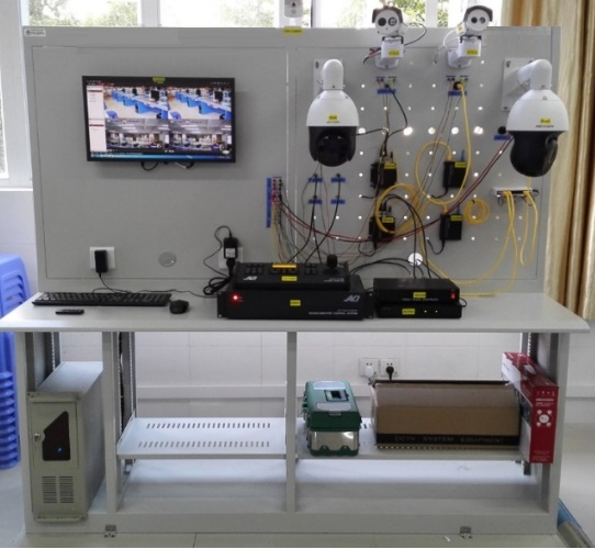 本實訓平臺的實現(xiàn)效果如圖1所示,交通視頻處理實驗操作臺整體采用優(yōu)質(zhì)冷軋鋼板作為主體結(jié)構(gòu),臺面防靜電,面板配備各種固定安裝套件以方便嵌入掛鉤進行實驗設(shè)備的安裝固定和穿線維護。實驗臺上能夠搭建的實驗儀器囊括了歷代視頻監(jiān)控攝像機,包括第一代的模擬視頻監(jiān)控系統(tǒng)(CCTV),第二代的基于“PC+多媒體卡”數(shù)字視頻監(jiān)控系統(tǒng)(DVR),第三代的完全基于IP網(wǎng)絡視頻監(jiān)控系統(tǒng)(IPVS),第四代的是目前正在快速發(fā)展的基于移動互聯(lián)、云計算、云存儲等新技術(shù)的視頻監(jiān)控系統(tǒng),這些設(shè)備既可以收納到實驗臺的抽屜中,也可以靈活地安裝固定在面板上。