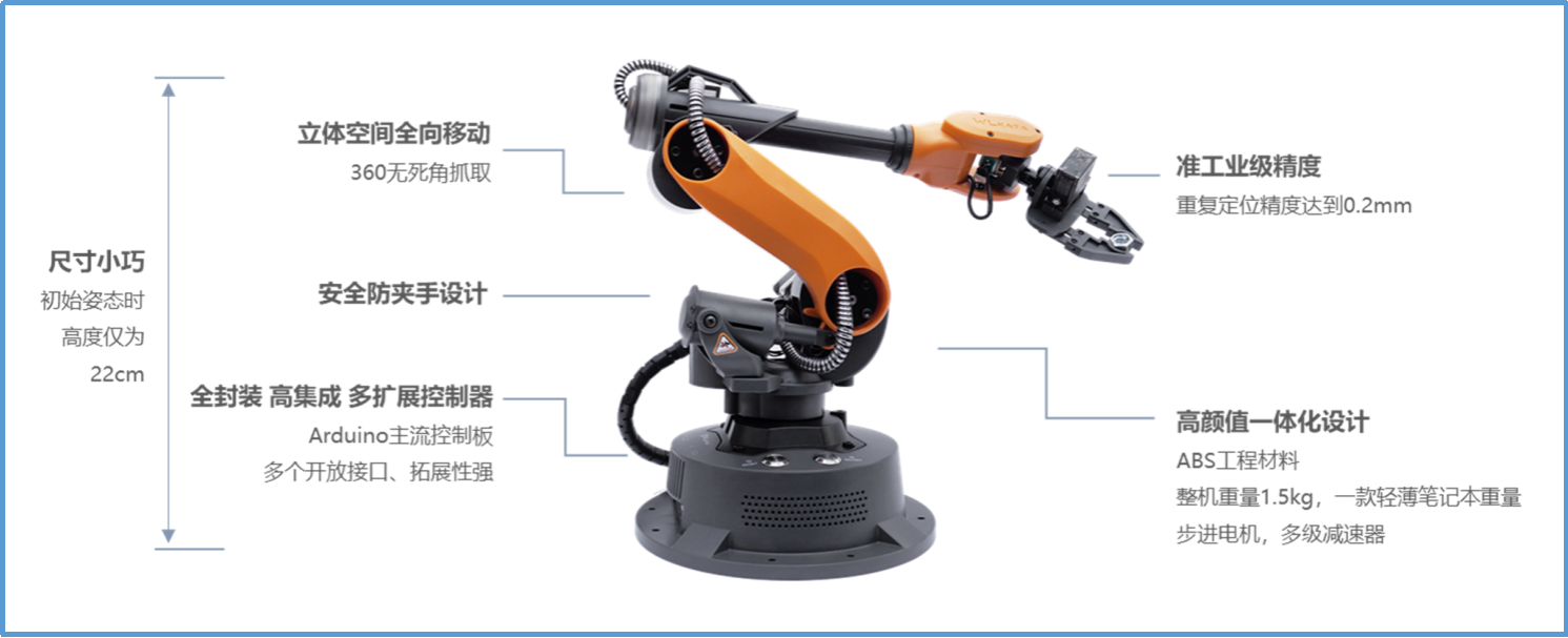 Mirobot六軸機器人可完成機器人搬運碼垛、裝配、軌跡規(guī)劃等典型任務,同時可實現(xiàn)寫字畫畫、激光雕刻等多種功能,支持PC端Studio、手機APP、示教器等控制方式。