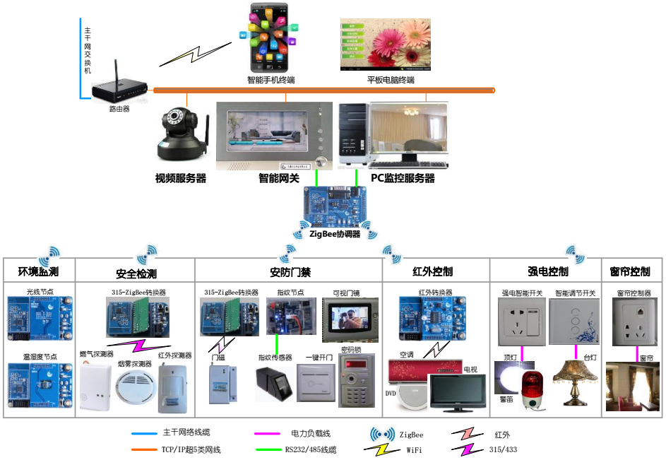 LGWL-JJ02A型 智能家居實(shí)訓(xùn)系統(tǒng)設(shè)備是針對(duì)高等院校物聯(lián)網(wǎng)實(shí)訓(xùn)的需求,綜合運(yùn)用傳感器采集、設(shè)備控制、無(wú)線(xiàn)傳感器網(wǎng)絡(luò)、嵌入式系統(tǒng)、網(wǎng)絡(luò)通信、中間件等物聯(lián)網(wǎng)技術(shù)以及多學(xué)科技術(shù)的交叉融合,依托部署在網(wǎng)板上的各種傳感器節(jié)點(diǎn)、控制節(jié)點(diǎn)、智能網(wǎng)關(guān)、智能終端實(shí)現(xiàn)家居生活環(huán)境的智能安全監(jiān)測(cè)、智能安防監(jiān)測(cè)、智能報(bào)警、智能設(shè)備控制、遠(yuǎn)程視頻監(jiān)控、網(wǎng)絡(luò)化遠(yuǎn)程監(jiān)控等功能,貼近實(shí)際智能家居系統(tǒng),為物聯(lián)網(wǎng)專(zhuān)業(yè)教學(xué)提供了一個(gè)完備的應(yīng)用實(shí)訓(xùn)系統(tǒng)。 系統(tǒng)利用各種傳感器測(cè)量家居環(huán)境參數(shù),結(jié)合嵌入式數(shù)據(jù)庫(kù)存儲(chǔ)技術(shù)將歷史數(shù)據(jù)統(tǒng)一保存管理;利用無(wú)線(xiàn)傳感器網(wǎng)絡(luò)統(tǒng)一管理各個(gè)節(jié)點(diǎn);利用自動(dòng)控制理論和反饋控制理論實(shí)現(xiàn)智能控制與無(wú)人值守;利用嵌入式 Linux 系統(tǒng)實(shí)現(xiàn)智能網(wǎng)關(guān);利用 Android 系統(tǒng)實(shí)現(xiàn)智能終端,促使學(xué)生了解物聯(lián)網(wǎng)技術(shù)在智能家居等現(xiàn)實(shí)環(huán)境的應(yīng)用。