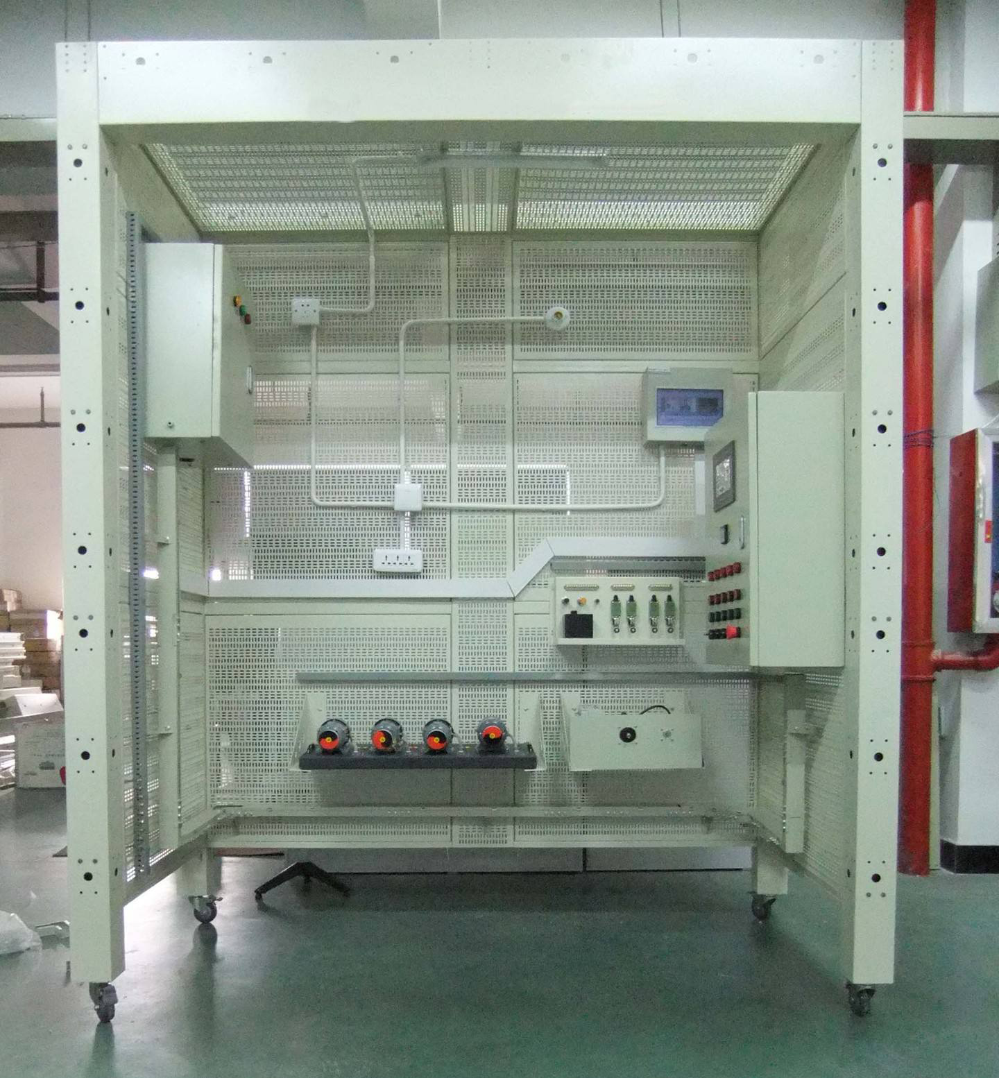 8、要求采用鋼制網孔板和鋼制專用型材組接而成,安裝有自鎖式腳輪。裝置表面噴塑,配有專用電源臺。設計高度以人站在一級人字梯即可方便操作的高度,橫向、叢向寬度合適,可以模擬現(xiàn)場線路的轉向布置。網孔板可以方便拆下。帶有穿管孔,使用扎帶固定線管,在穿出網孔板時可以使用壁疏引出導線穿入明裝底盒。配套的PVC管彎管器,可方便的對PVC管彎成90度。鋼制鏤空方形樑骨的使用,使該裝置結構牢固,便于連接,能實現(xiàn)暗管掩引等技術的真實操作,且可實現(xiàn)兩套,四套設備的聯(lián)合使用。電源控制模塊,配置有電源指示,三相漏電保護,緊急停止開關,安全插座引孔,作為設備入線控制。