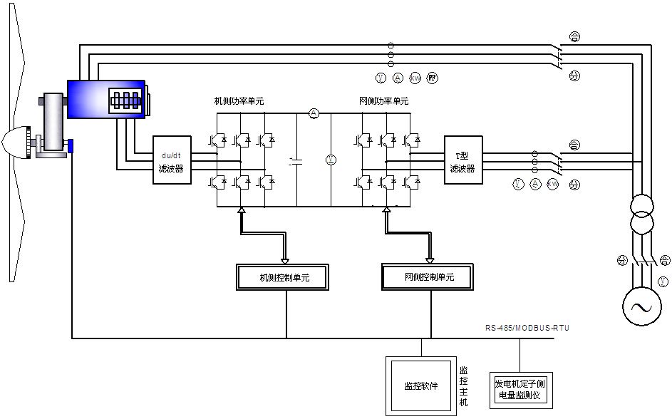 包括雙饋異步風(fēng)力發(fā)電機組、風(fēng)力機控制柜、雙饋變流器柜、大功率三相自耦調(diào)壓器、監(jiān)控軟件六個部分。