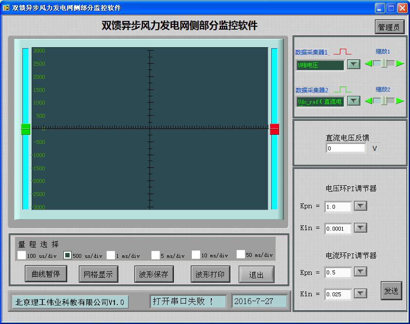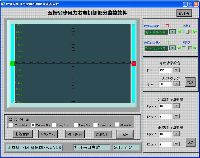 機側(cè)控制器的作用主要有兩個方面,一是給雙饋發(fā)電機的轉(zhuǎn)子提供勵磁分量的電流,從而可以調(diào)節(jié)雙饋發(fā)電機的定子側(cè)所發(fā)出的無功功率;二是通過控制雙饋發(fā)電機轉(zhuǎn)子轉(zhuǎn)矩分量的電流控制發(fā)電機的轉(zhuǎn)速或控制發(fā)電機定子側(cè)所發(fā)出的有功功率,從而使發(fā)電機運行在風(fēng)力機的*佳功率曲線上,實現(xiàn)*大風(fēng)能追蹤(捕獲)運行。機側(cè)控制器面板安裝有兩個信號指示燈,16鍵PVC軟鍵盤,240*128點蘭色液晶屏及9個波形測試端子。信號指示燈可對控制器工作、保護狀態(tài)分別指示;鍵盤可完成機側(cè)控制器啟動/停止設(shè)置,*大功率啟動/停止跟蹤設(shè)置,有功/無功給定,手動并網(wǎng)/離網(wǎng);液晶屏可顯示轉(zhuǎn)速反饋值,有功/無功反饋值;波形測試端子可通過示波器觀測發(fā)電機機轉(zhuǎn)子、定子相電流波形,可觀測發(fā)電機定子相電壓、電網(wǎng)相電壓波形。