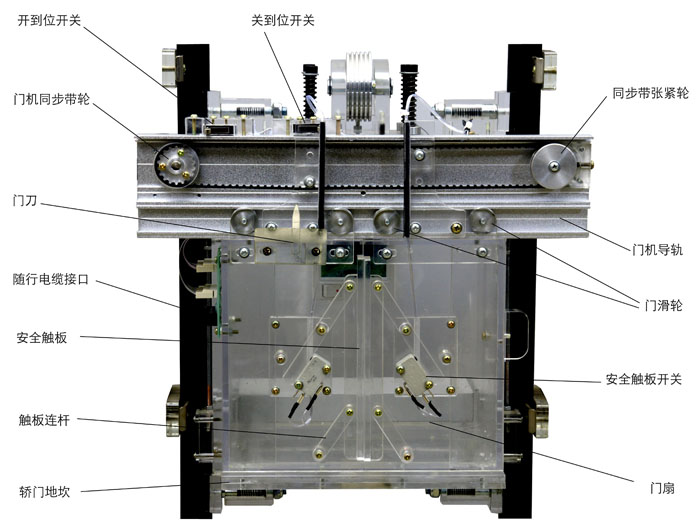 在轎廂門的邊沿上,裝有活動(dòng)的安全觸板。當(dāng)門在關(guān)閉過程中,安全觸板與乘客或障礙物相接觸時(shí),通過與安全觸板相連的聯(lián)桿,觸及裝在轎廂門上的微動(dòng)開關(guān)動(dòng)作,使門重新打開,避免事故發(fā)生。