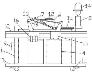 如圖1和圖2所示,一種電梯門機實訓裝置,包括架體1,架體1上下分別固定門導軌2和地坎3,兩個轎門4頂部分別通過門刀16和門掛板組件5連接在門導軌2上,轎門4底部卡接在地坎3上,轎門4的門掛板組件5頂部通過連桿機構(gòu)7與設(shè)置在架體1頂部的門機減速裝置6和電機13相連,門機減速裝置6設(shè)置門機控制器12,架體1的底架上設(shè)置配重塊10,架體1頂部設(shè)置照明燈14和手動控制機構(gòu)8,架體1上設(shè)置一個電源9,架體1底部設(shè)置萬向輪11,轎門4頂部的架體上安裝有到位開關(guān)15。