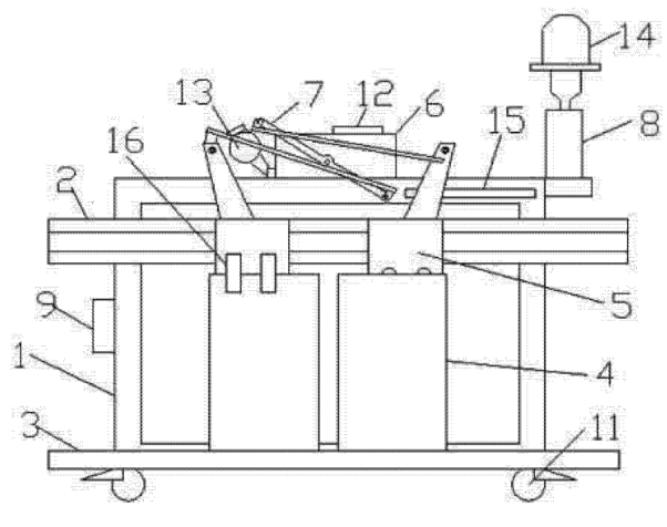 圖中1架體、2門導軌、3地坎、4轎門、5門掛板組件、6門機減速裝置、7連桿機構(gòu)、8手動控制機構(gòu)、9電源、10配重塊、11萬向輪、12門機控制器、13電機、14照明燈、15到位