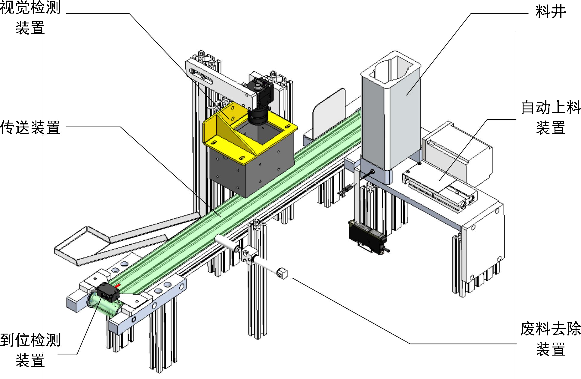 多功能料井為鋁合金材質(zhì),可兼容正方形、長(zhǎng)方形和圓形三種形狀的物料塊以固定的姿態(tài)到達(dá)料井底部,料井底部設(shè)置有反射型光纖傳感器,當(dāng)傳感器檢測(cè)到有物料落下時(shí),觸發(fā)自動(dòng)上料裝置,雙軸氣缸將物料推送到傳送裝置上。傳送裝置上電機(jī)配合精密減速器驅(qū)動(dòng)傳送帶模擬真實(shí)工廠的流水線,在流水線的中間設(shè)置有視覺(jué)檢測(cè)裝置,檢測(cè)合格產(chǎn)品可以到達(dá)傳送帶的末端,不合格產(chǎn)品作為廢料,由廢料去除裝置推出傳送帶。在傳送帶末端配有精密傳感器感應(yīng)產(chǎn)品是否到位。