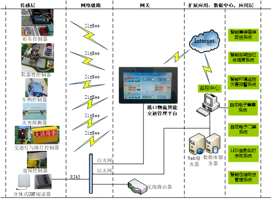 倉儲物流交通實訓系統(tǒng)覆蓋物聯(lián)網(wǎng)的傳感層、網(wǎng)絡(luò)鏈路層、網(wǎng)關(guān)、以及應(yīng)用層。智能網(wǎng)關(guān)是整個系統(tǒng)的核心,是連接傳感層與應(yīng)用層的橋梁。系統(tǒng)拓撲如圖所示。