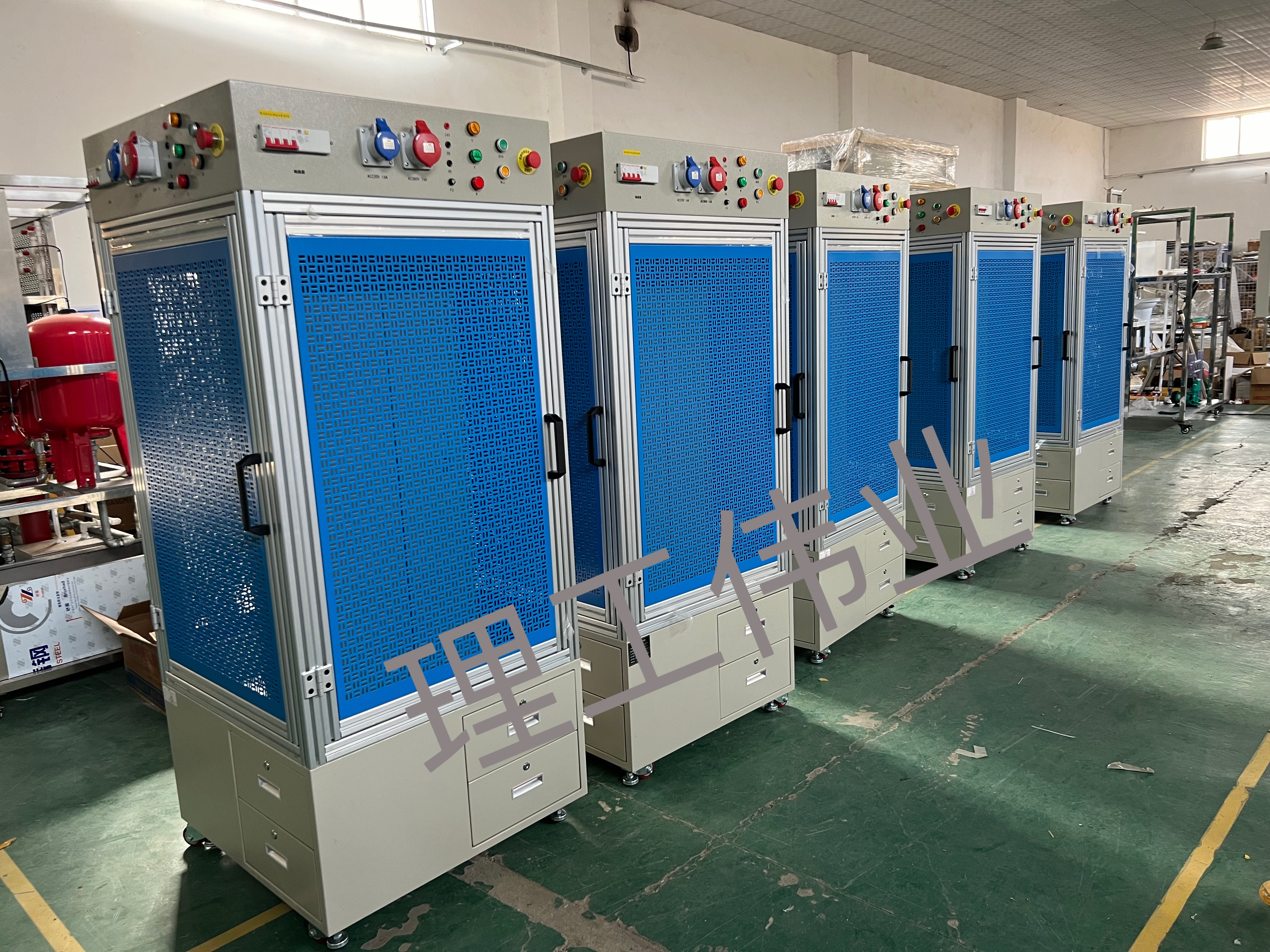 LGWX-04A型 四工位電氣安裝實訓(xùn)臺底柜采用≥1.5mm厚冷軋鋼板折彎焊接制成,表面經(jīng)酸洗磷化后,靜電噴塑完成,整體美觀大方,結(jié)構(gòu)輕便,產(chǎn)品耐壓,強度大、抗沖擊不易變形,底部配有底腳及轉(zhuǎn)輪,方便固定及移動;實訓(xùn)面由40系列優(yōu)質(zhì)歐標(biāo)鋁型材搭建,材質(zhì)外表光潔防腐蝕,終身免維護(hù),高強度的鋁型材加科學(xué)的模塊設(shè)計,方便調(diào)整、拆卸和組裝;中間實訓(xùn)面由≥1.2mm厚冷軋鋼板折彎、焊接、沖孔后內(nèi)嵌于實訓(xùn)框中,表面靜電噴塑,顏色為淺藍(lán)色;電氣單元采用≥1.5mm厚冷軋鋼板折彎焊接制成,表面經(jīng)酸洗磷化后,靜電噴塑完成,每個工位提供:1個斷路器(帶漏電保護(hù)模塊);1個380V 16 A插座,1個220V 16 A插座,4毫米的安全插口 3個(24V、0V、PE),1個熔斷器(控制線路保護(hù)),1個急停開關(guān),1個紅色啟動指示燈,3個電源指示燈(黃,綠,紅)。