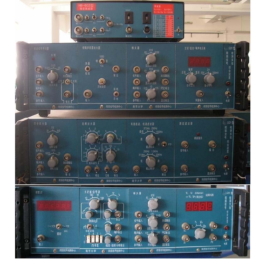LG-XH05型 微弱信號檢測實驗綜合裝置由十多個單元實驗盒和幾個配有電源的插入式機箱組成。通過組合,能開設(shè)十多個微弱信號檢測的教學(xué)實驗。通過不同的實驗部件盒組合,可以排出不同的實驗或組成不同類型的微弱信號檢測儀器。能方便、經(jīng)濟地排出學(xué)生要掌握的微弱信號檢測技術(shù)的基本實驗。同時也可以用這些組件構(gòu)成一個完整的鎖定放大器、同步積分器和多點信號平均器等等。