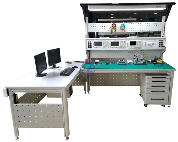 1.工作臺:桌身采用優(yōu)質(zhì)鋁型材做骨架,整機既堅固耐用,美觀大方。桌面采用25mm厚高密度纖維板,外貼防火板,PVC截面封邊,具有耐磨、耐熱、耐污、耐火、耐菌、防霉、抗靜電及易清潔等特點。工作臺設(shè)有防靜電配套裝置,桌面上方有實訓屏、模塊盒安放橫梁、工具網(wǎng)孔板、高檔條形LED照明。