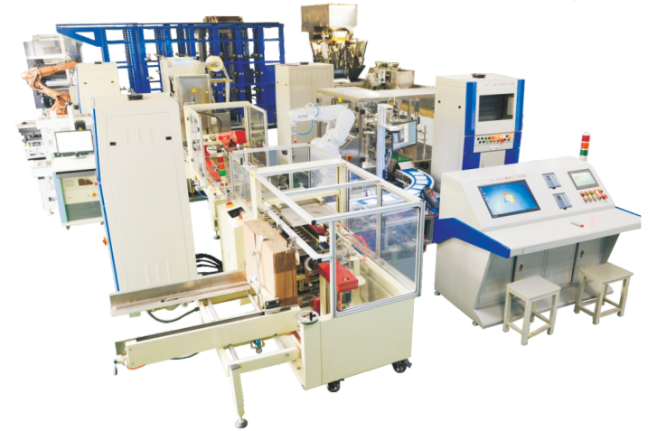 LGY-ZN012A型智能工廠實訓室由控制系統(tǒng)(PLC)、制造執(zhí)行系統(tǒng)(MES)、資源管理系統(tǒng)(ERP) 三層結(jié)構(gòu)組成,主要由PLC控制、顆粒包裝、液體包裝、工業(yè)機器人裝配、紙箱成型機、封箱機、激光打碼、貼標、掃碼器、工業(yè)機器人倉儲搬運、巷道式倉儲、吹膜單元、印刷單元、制袋單元、行走工業(yè)機器人搬運、AGV、RFID、掃碼定位、激光測距、氣動元件等組成。