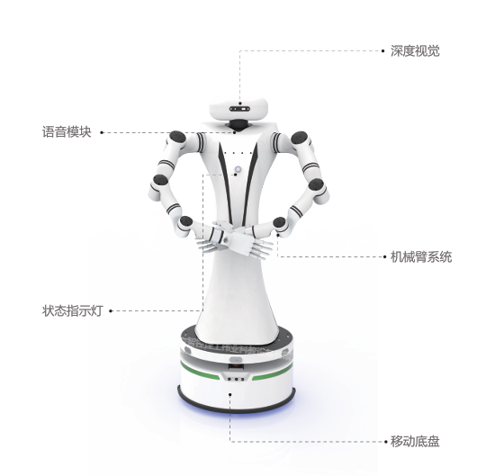 一.機(jī)器人整體組成:不少于1個(gè)主控模塊、不少于1個(gè)移動(dòng)底盤(pán)、不少于2條七軸機(jī)械臂、不少于1個(gè)末端執(zhí)行器、不少于1個(gè)深度視覺(jué)傳感器;