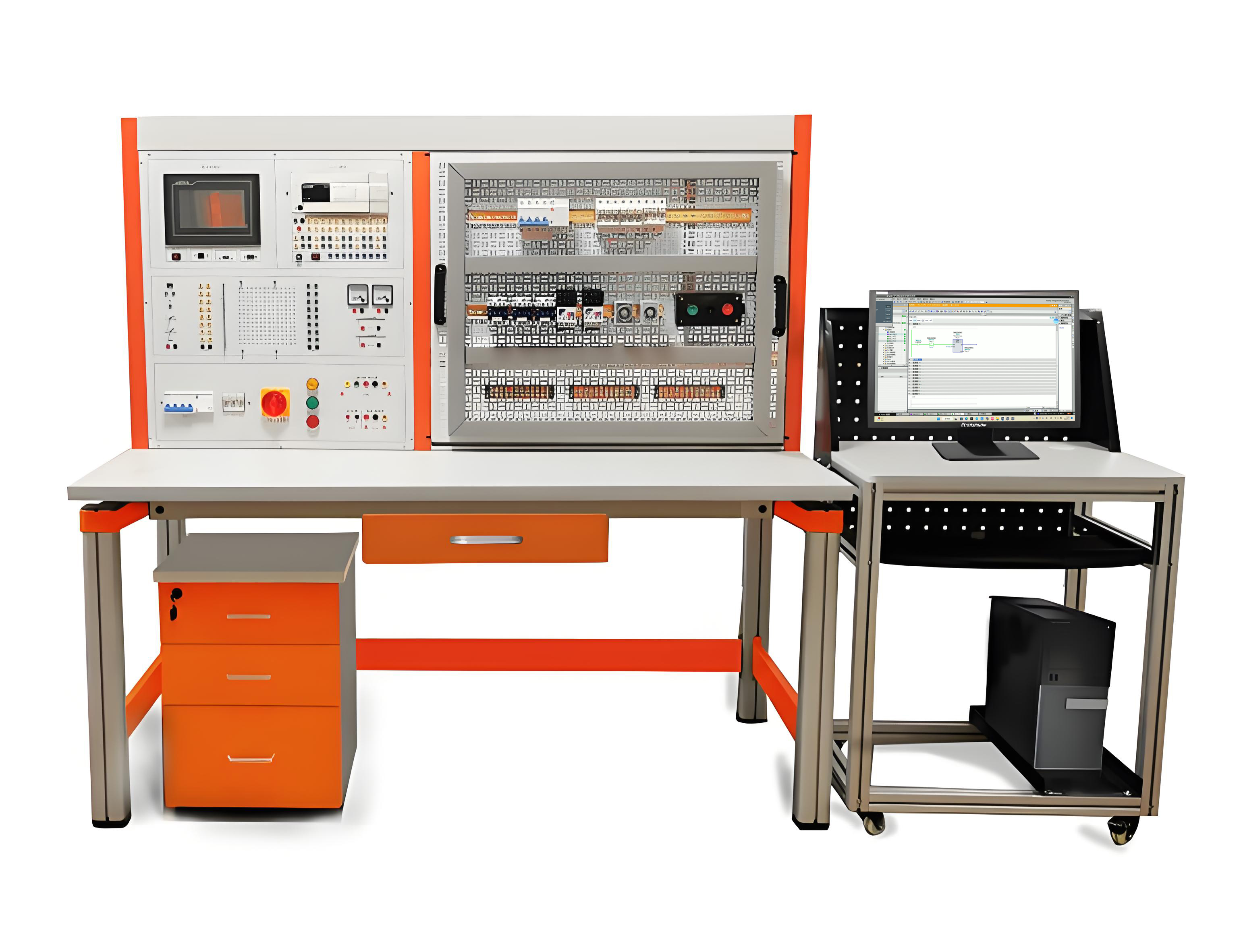 2、實訓桌:鋼木結(jié)構(gòu),桌面為防火耐磨材料制作,具有放置工具抽屜、鍵盤托、顯示器擱板。