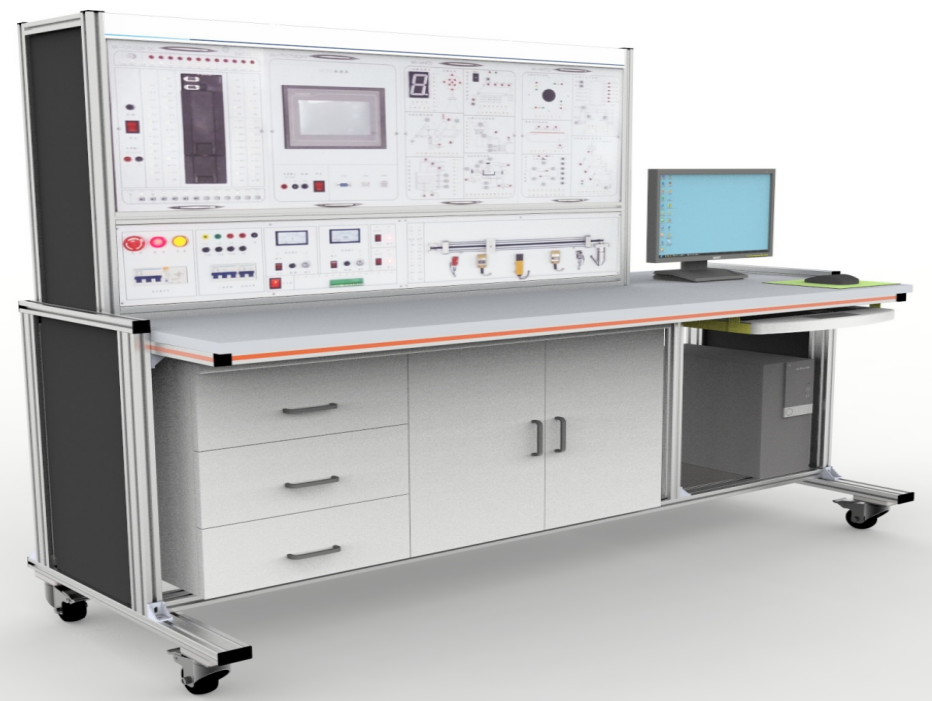 2、臺(tái)架構(gòu)成:實(shí)訓(xùn)臺(tái)采用工業(yè)鋁型材加工。桌面下面放置儲(chǔ)物柜,左側(cè)有3層抽屜,用于存放工具以及實(shí)訓(xùn)資料,右側(cè)為雙拉門(mén)式設(shè)計(jì),可以放置實(shí)訓(xùn)掛箱。底部裝有四個(gè)帶鎖止功能的萬(wàn)向輪。柜體后下側(cè)留有電源輸入線。預(yù)留計(jì)算機(jī)放置位置。