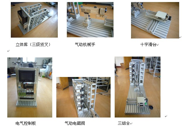 LGZH-02 柔性三組合機(jī)電一體化創(chuàng)新模型實(shí)現(xiàn)動(dòng)作為:首先立體庫(kù)堆垛機(jī)具有水平垂直運(yùn)動(dòng),由步進(jìn)電機(jī)拖動(dòng),帶動(dòng)貨叉,進(jìn)行貨物存取,貨叉為三級(jí)機(jī)械傳動(dòng)。氣動(dòng)機(jī)械手可實(shí)現(xiàn)手爪抓取,提升,轉(zhuǎn)半圈,放下,松開手爪。十字滑臺(tái)可走出四角上一周的四個(gè)位置,上方裝有筆架,可以繪圖寫字,上方還裝有接近開關(guān)和顏色開關(guān)及支架,可對(duì)滑臺(tái)上的物體進(jìn)行識(shí)別。