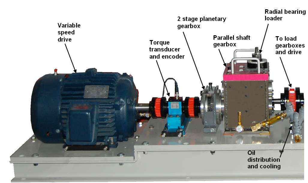 直齒圓柱齒輪或斜齒輪的表面磨損,裂齒,缺齒牙缺失的影響故障,如可以證明,誘導(dǎo)。滾動(dòng)軸承的故障,如內(nèi)圈,外圈,將球破壞也可以被納入??烧{(diào)游隙的研究齒隙是可能的:增加間隙量沒(méi)有重大的后果,并減少齒隙可以導(dǎo)致結(jié)合和/或過(guò)高的操作溫度。傳動(dòng)系統(tǒng)不對(duì),也可以有意引進(jìn)的DPS。這些故障中的任何一種可以被添加到傳動(dòng)系的一個(gè)在一個(gè)時(shí)間,或同時(shí)研究斷層間相互作用。扭轉(zhuǎn)和徑向載荷可應(yīng)用于研究損壞簽名或傳播扭轉(zhuǎn)載荷被施加在齒輪和/或軸承:經(jīng)由10的HP可變頻率的AC驅(qū)動(dòng)器與一個(gè)可編程的,用戶定義的速度分布;和徑向載荷被施加軸在平行變速箱。隨著的可編程負(fù)載驅(qū)動(dòng),負(fù)載波動(dòng)可以應(yīng)用于模擬現(xiàn)實(shí)生活中加載條件。
