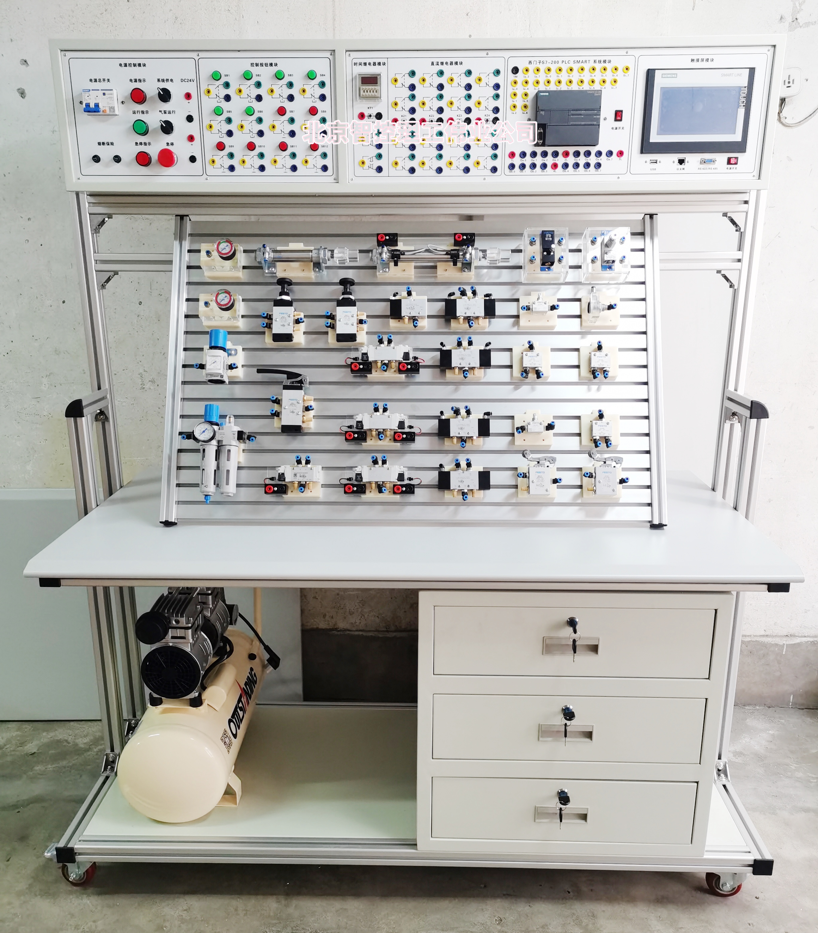 1、系統(tǒng)采用電、氣一體化結(jié)構(gòu),下半部分為標(biāo)準(zhǔn)化氣動(dòng)實(shí)訓(xùn)板,用以完成氣動(dòng)元件的安裝固定、氣路及電路的連接;上半部分為自動(dòng)化控制箱,用以完成PLC、低壓電器等的安裝和接線。