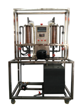 采用透明耐壓玻璃作殼體的壓縮機(jī)、盤管蒸發(fā)器、盤管冷凝器。循環(huán)水泵,玻璃轉(zhuǎn)子流量計(jì),調(diào)節(jié)閥門組、PVC板冷卻水箱;測試系統(tǒng)由8路萬能信號輸入液晶顯示巡檢儀、PT100熱電偶組成;有工作臺架可隨時(shí)移動。