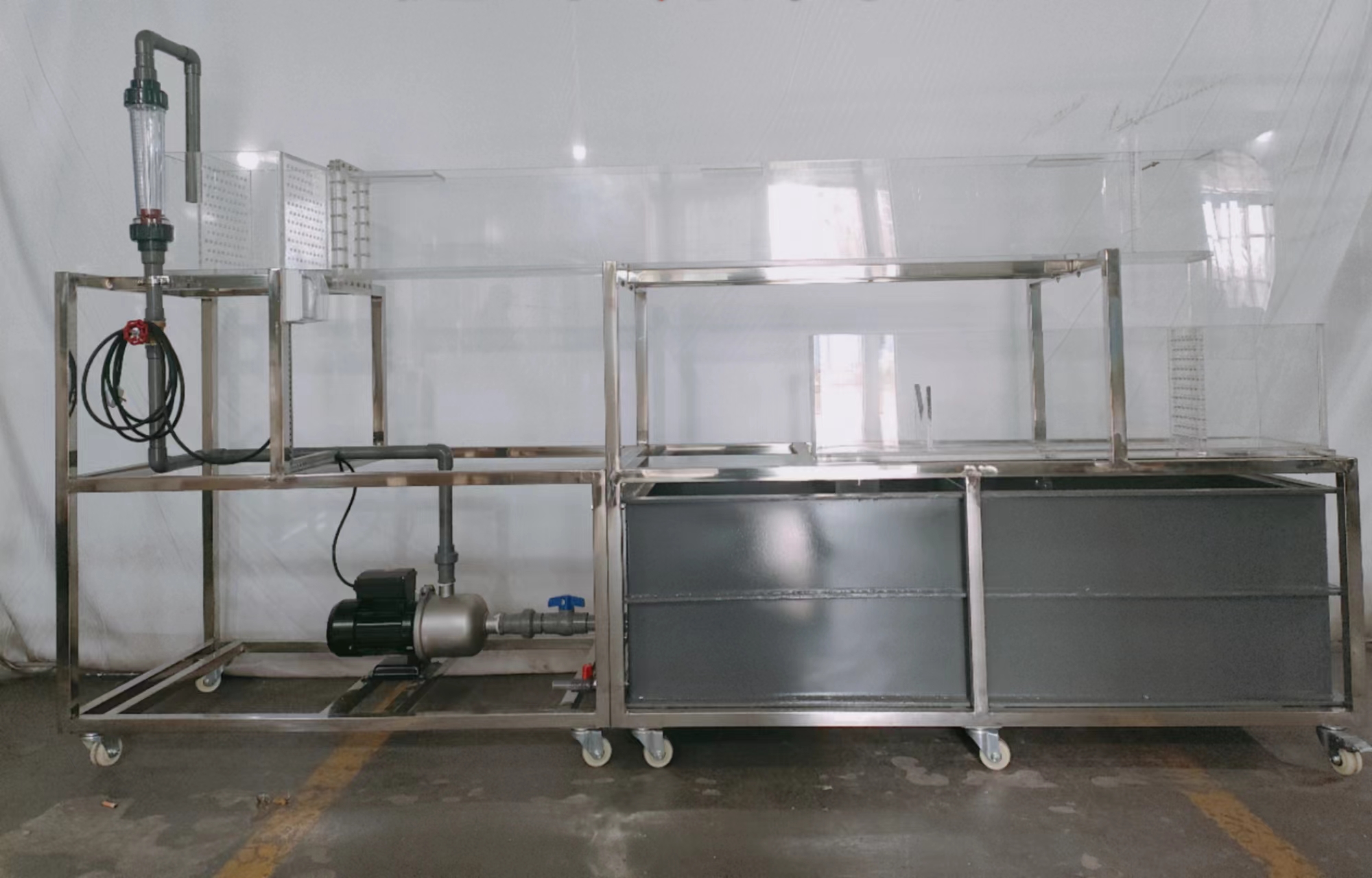 1、上、中、下槽空間三疊層緊縮布置,上工作槽:長×寬×高(凈值)=2700×100×200mm,有機玻璃,壁厚10mm。