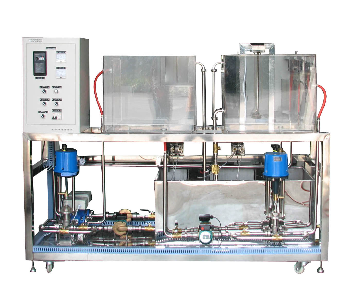 1.機(jī)械主體設(shè)備:設(shè)備整體框架、加熱水箱、液位水箱、水槽、工業(yè)管路、儀表控制臺(tái)。