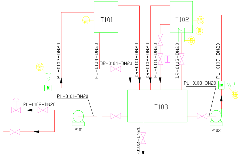 LG-GKY02型 化工儀表維修工競(jìng)技實(shí)訓(xùn)裝置主要工藝流程:整體實(shí)訓(xùn)裝置由儲(chǔ)水箱(T103)、加熱水箱(T102)和液位水箱(T101)等組成。動(dòng)力系統(tǒng)分兩路,其中一路由循環(huán)水泵、調(diào)節(jié)閥、電磁流量計(jì)組成,它的動(dòng)力水可以到加熱水箱;另一路由循環(huán)水泵、變頻機(jī)構(gòu)、渦輪流量計(jì)組成,它的動(dòng)力水可以到加熱水箱和液位水箱。