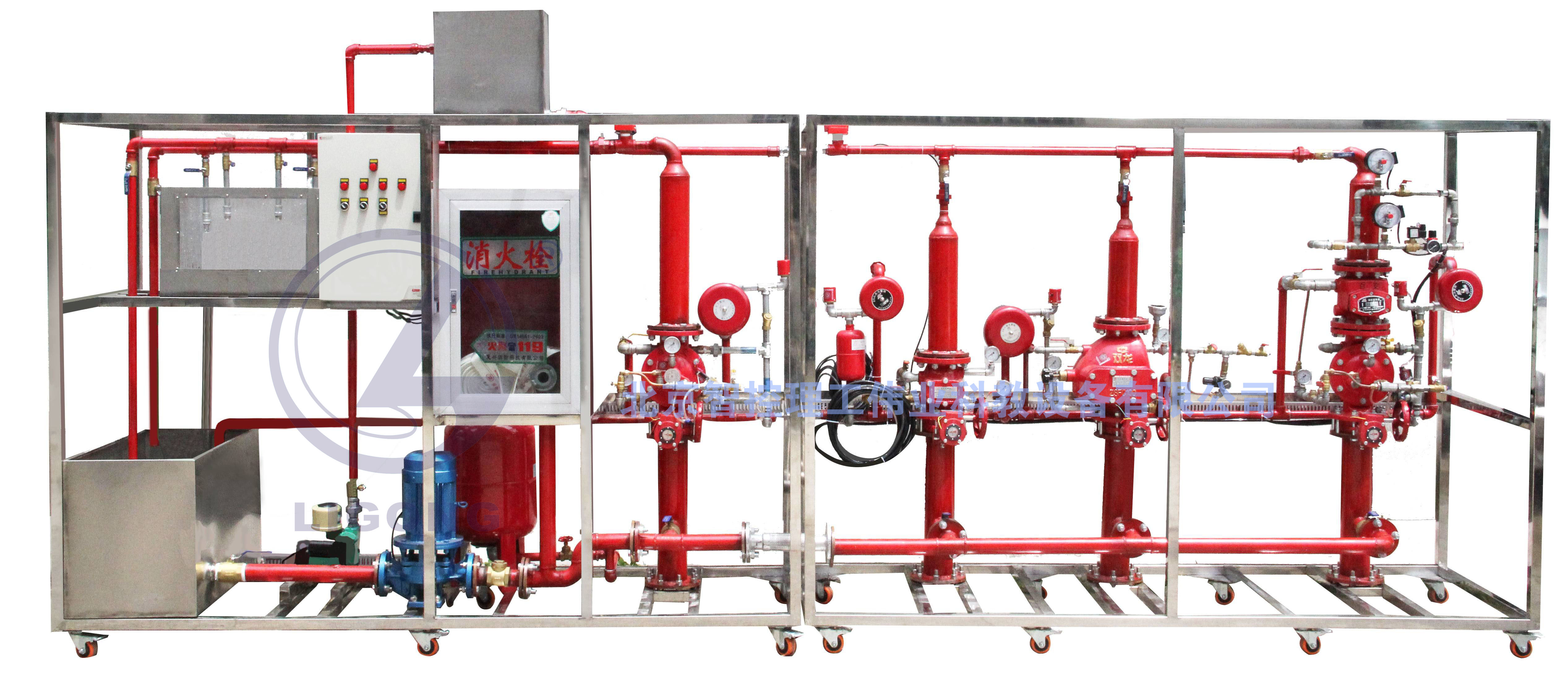 2、自動(dòng)噴水滅火系統(tǒng)與消火栓系統(tǒng)共用低位消防水箱與屋頂消防水箱,并由消防水泵、穩(wěn)壓增壓設(shè)備,氣泵、濕式報(bào)警閥,干式報(bào)警閥,雨淋報(bào)警閥,預(yù)作用報(bào)警閥,水流指示器,噴頭,末端試水裝置組成完整的自動(dòng)噴水滅火系統(tǒng),可以演示濕式自動(dòng)噴水、干式、雨淋、預(yù)作用滅火系統(tǒng)的組成與工作原理。