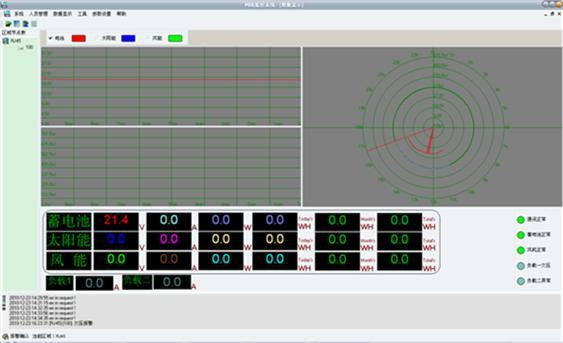 顯示內(nèi)容:蓄電池電壓、風(fēng)機(jī)電壓、光伏電壓、風(fēng)機(jī)電流、光伏電流、風(fēng)機(jī)功率、光伏功率,能量模擬圖,當(dāng)前風(fēng)速(米/秒),當(dāng)前風(fēng)向(度),當(dāng)前風(fēng)力資源平估。