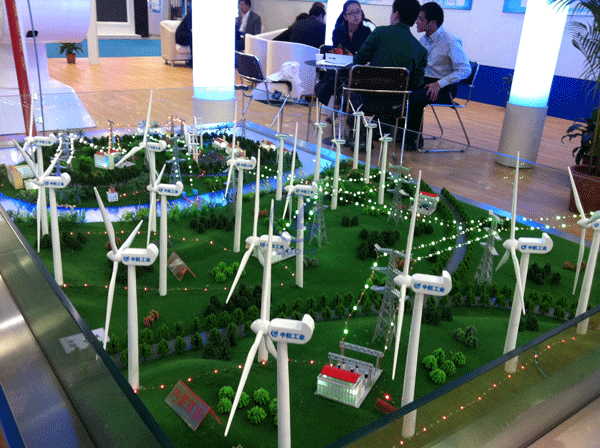 風(fēng)電場(chǎng)模擬動(dòng)態(tài)沙盤(pán):大型風(fēng)電場(chǎng)布局比例設(shè)計(jì);模型整體布局為沙盤(pán)式,沙盤(pán)上布局20個(gè)小型風(fēng)力發(fā)電機(jī)模型,各風(fēng)機(jī)布局為錯(cuò)開(kāi)式布置。風(fēng)機(jī)電動(dòng)演示,設(shè)置升壓站,輸電鐵塔、辦公樓等設(shè)施風(fēng)機(jī)、升壓站、輸電線路、場(chǎng)區(qū)環(huán)境,風(fēng)機(jī)電動(dòng)演示;