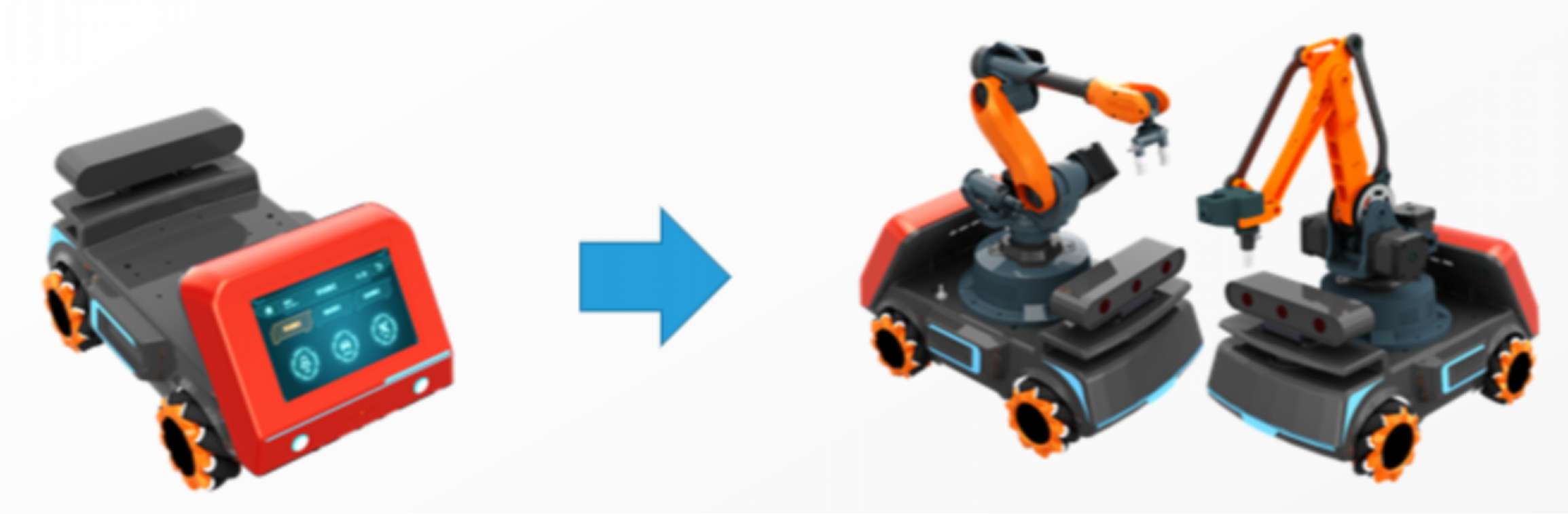 ROS移動機器人*1;導航掃描單元*1;機器人末端視覺模塊*1;桌面六軸機器人*1