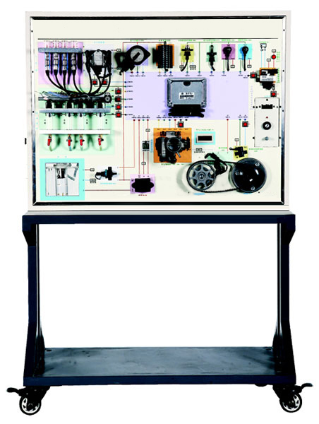 汽車汽油發(fā)動機(jī)電控系統(tǒng)示教板完整展示了上海大眾桑塔納2000AJR型閉路電子控制多點(diǎn)燃油噴射式發(fā)動機(jī)的電控系統(tǒng),設(shè)備包括發(fā)動機(jī)電控單元、空氣流量計、進(jìn)氣溫度傳感器、節(jié)氣門組件、發(fā)動機(jī)轉(zhuǎn)速傳感器、霍爾傳感器、冷卻液溫度傳感器、氧傳感器、爆震傳感器、噴油器、點(diǎn)火線圈、燃油泵等真實(shí)汽車部件,能動態(tài)演示電控發(fā)動機(jī)燃油噴射、電子點(diǎn)火及調(diào)整過程,面板上設(shè)有相關(guān)測試點(diǎn)和故障設(shè)置開關(guān),便于教師利用儀器儀表對其測試和故障現(xiàn)象模擬。