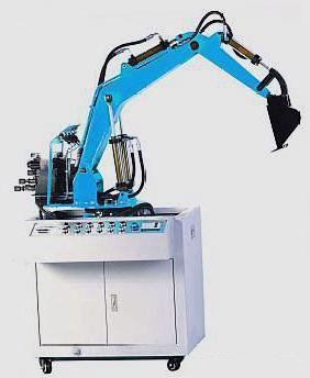 3、挖掘機械按實物比例縮小的全金屬結構,實驗時啟動液壓系統(tǒng)根據實驗要求模以操作機械進行工作。
