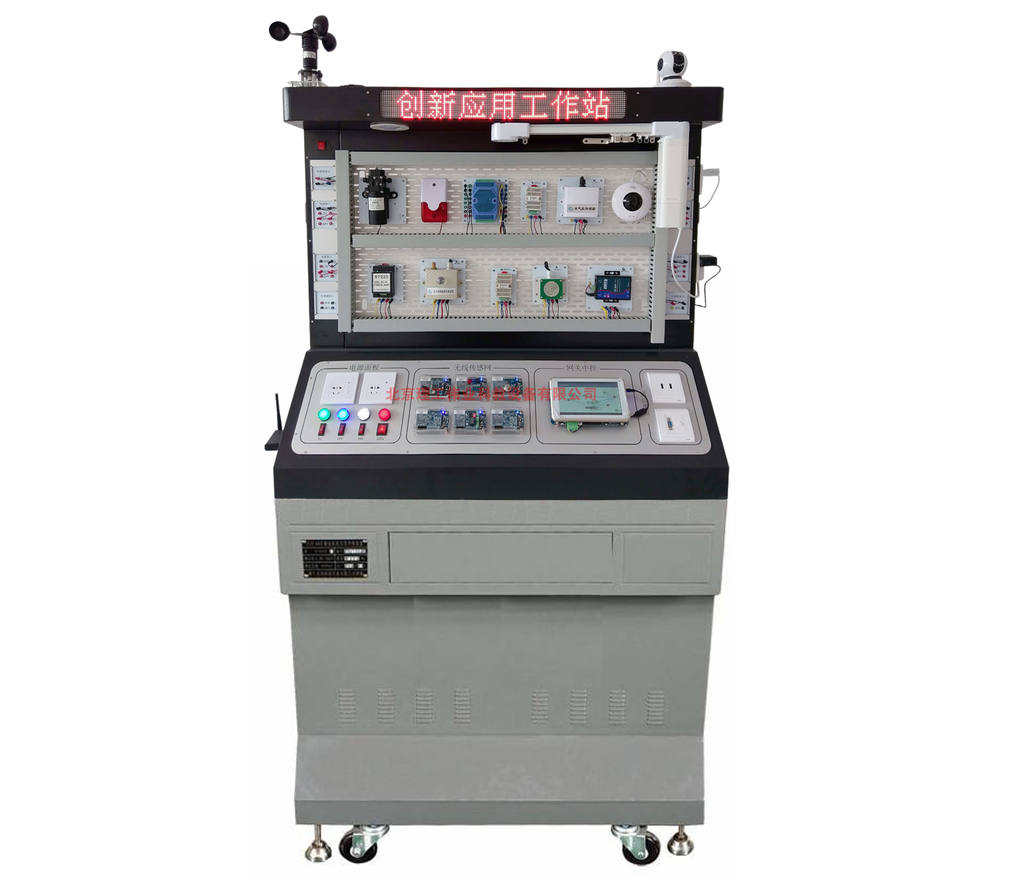 1. 標(biāo)配網(wǎng)孔操作板、四組供電接口、四組有線傳感器的電源通信接口、六個(gè)無線傳感節(jié)點(diǎn)的供電接口、網(wǎng)關(guān)供電接口、兩個(gè)強(qiáng)電控制插座、各類電源帶燈按鈕、大屏點(diǎn)陣顯示屏等,為創(chuàng)新創(chuàng)意應(yīng)用場景提供支持。