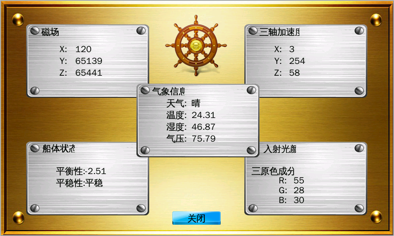 該系統(tǒng)表征了傳感器在航海導(dǎo)航領(lǐng)域的應(yīng)用,界面顯示海上航行船舶的狀態(tài)信息及所處周圍環(huán)境、氣象信息等。