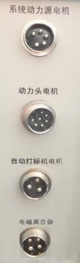 (1)動(dòng)力系統(tǒng)接口單元操作面板主要由四個(gè)開爾文插座組成,從上到下依次為五芯、七芯、 三芯和四芯插座。分別用于連接系統(tǒng)動(dòng)力源電機(jī)、動(dòng)力頭電機(jī)、自動(dòng)打標(biāo)機(jī)電機(jī)(含急停按鈕)、 電磁離合器(含限位開關(guān))。